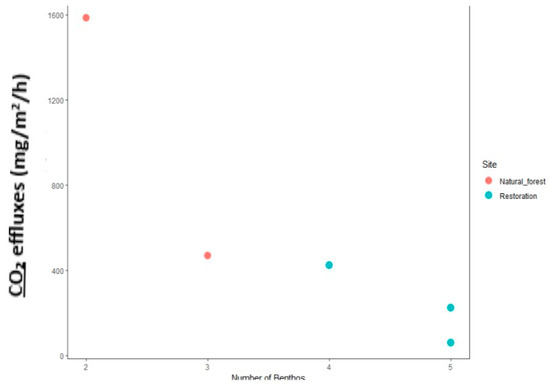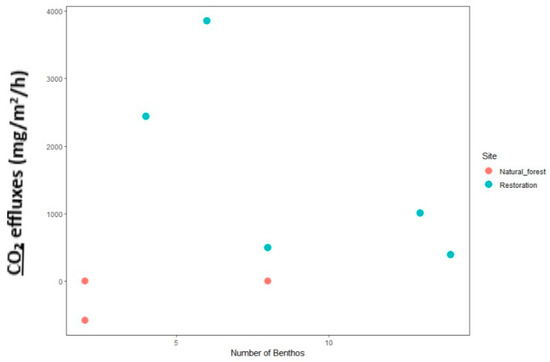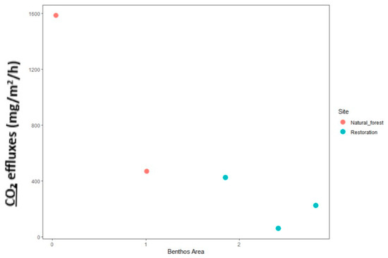 Macrozoobenthos hole area to CO2 flux level of natural forest and restoration during the dry season.