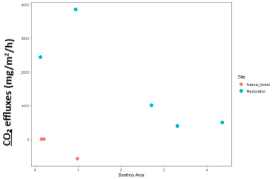 Macrozoobenthos hole area to CO2 flux level of natural forests and restoration during the rainy season.
