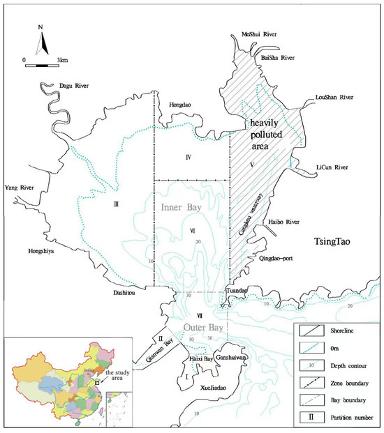 Topography and regional division map of Jiaozhou Bay, China.