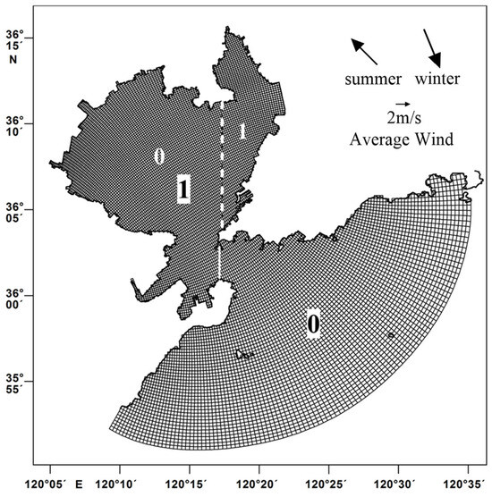 Jiaozhou Bay is characterized as a strong tidal bay, with most areas being relatively shallow. The bay mouth and channels, among other deep-water areas, exhibit robust dynamics and there is no significant seasonal stratification in the entire bay, with the baroclinic effect being negligible [28,30,32]. Therefore, the model only considered barotropic processes. The rivers flowing into the bay are mostly mountain streams with rainwater sources and have long dry periods. Coupled with upstream reservoir construction, the run-off volume is extremely limited. Most are now perennially dry, with estuaries also serving as sewage outlets [2]. Affected by the east Asian monsoon, the precipitation in Jiaozhou Bay is mainly concentrated in summer and the average annual precipitation is 687.5 mm. However, in the late 1970s, it changed from a relatively rainy period to a relatively dry period [51]. Moreover, the construction of sponge cities around the bay and the relatively small bay area determine that precipitation is a secondary factor for seawater exchange in Jiaozhou Bay. The small salinity difference inside and outside the bay and the small seasonal difference of water salinity in the bay also prove this point [2]. Hence, the dilution effect of freshwater was not considered in the present study.The initial concentration field of the tracer (dye) in the model was set according to the following principles. The initial concentration of the part of the water body of concern was set to one unit. The concentration in the rest of the water body was set to zero. When the tracer reached the open boundary, its concentration was immediately set to zero. As shown in Figure 2, the initial dye concentration was set to one within the bay mouth area and zero outside.