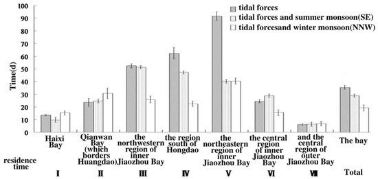 Comparison of the average residence time of each partition in Jiaozhou Bay; error bars represent a 95% confidence interval.