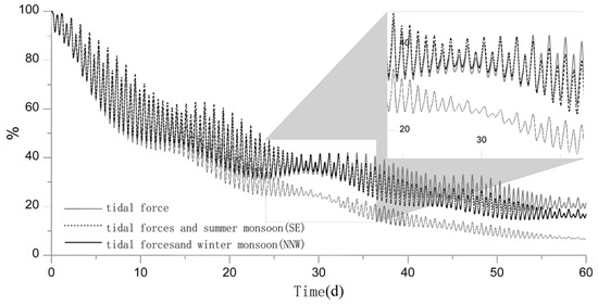 The simulation results showed that during flood tides, Yellow Sea water bodies enter Jiaozhou Bay through the inlet, mixing with the water bodies within the bay. During ebb tides, the mixed water mass brought in by the tidal inflow is expelled from the bay, some of which is lost through exchange with the external Yellow Sea water bodies while the rest of the mixed water mass and new Yellow Sea water bodies reenter Jiaozhou Bay with the next flood tide. Thus, the bay’s water bodies are gradually replaced by Yellow Sea water bodies. A comparison among the three different conditions (Figure 4) showed that the tracer concentration decreases in a nearly exponential manner over time, albeit at different rates. The decay process displays a semi-monthly oscillation, coinciding with the spring–neap cycles. Water exchange is faster during spring tides and slower during neap tides. This suggests that the presence of monsoons does not fundamentally alter the water exchange process in Jiaozhou Bay and that the tide remains the dominant factor.