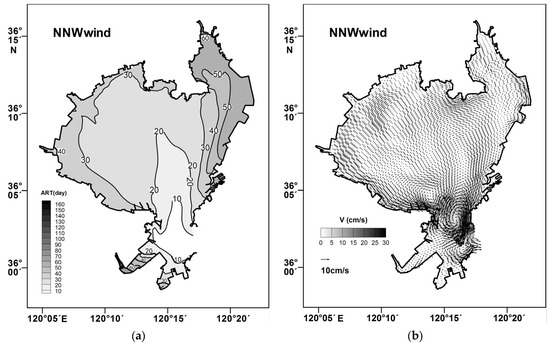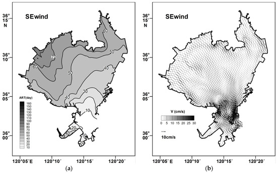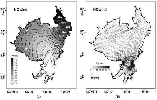The average residence time (ART) distribution and residual current were obtained with tidal forcing only. (a) The average residence time; (b) The residual current.