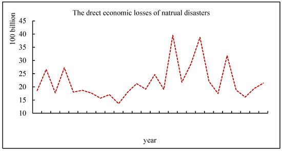 China has complex geographical and climatic conditions, as well as a wide variety of natural disasters, and this country has the highest frequency of natural disasters in the world. Floods, droughts, earthquakes, typhoons, mudslides, forest fires, and other disasters occur every year, and they have obvious regional, seasonal, and phased characteristics. These frequent natural disasters have severe consequences, such as high death tolls, the destruction of infrastructure, and stagnated regional economic development. From 1995 to 2020, the average direct economic losses caused by natural disasters in China each year totaled 300 billion yuan (Figure 1).