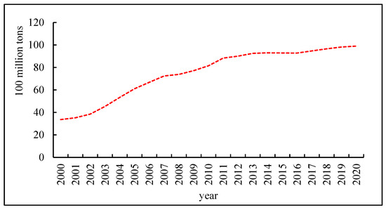 In addition, China is the world’s largest energy consumer and its total energy consumption was 4.98 billion tons of standard coal in 2020, where coal consumption accounted for 56.8% of the total energy consumption, and natural gas, hydropower, nuclear power, wind power, and other forms of clean energy consumption accounted for 24.3%. Since 2007, China has surpassed the United States in terms of total carbon emissions and it is ranked first in the world. According to statistics, China’s carbon emissions increased each year from 2000 to 2020 (as shown in Figure 3), and the total carbon emissions were nearly 10 billion tons in 2020, with an average annual growth rate of about 5%. At the 75th session of the United Nations General Assembly in September 2020, China clearly proposed “carbon peaking” by 2030 and “carbon neutrality” by 2060, or the “double carbon” target. This plan vigorously seeks to peak carbon emissions in the years before 2030 and achieve carbon neutrality in the years before 2060. Actively optimizing the energy consumption structure, promoting transformation and upgrading of the industrial structure, and vigorously supporting technological innovation have become important methods for controlling carbon emissions in China.