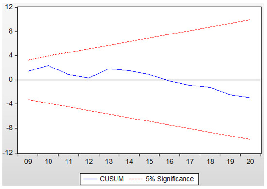 Based on similar studies [31,32], the diagnostic results for the model are presented in Table 9, where the residual Q statistic showed that the model was not serially correlated, the Jarque–Bera test statistic showed that the residuals were normal, the Autoregressive Conditional Heteroskedasticity (ARCH) test showed that there was no heteroskedasticity, and the Ramsey test indicated that the model was reliable.