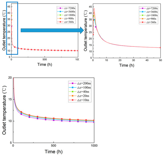 In models involving discrete and unsteady heat transfer simulations, both the time step and the number of nodes affect the computational speed and accuracy of the simulation. In order to ensure the accuracy of the simulation results, the time step and radial step are independently verified. As shown in Figure 1, the time step ∆t = 3600 s and the radial step ∆z = 20 m selected in this paper meet the calculation accuracy requirements.