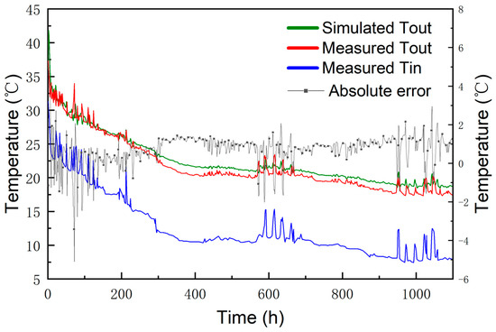 After the heat transfer model of the buried tube heat exchanger is established, it needs to be compared and verified with the actual operation data to determine the reliability. Therefore, the running data of a residential project in Chang’an District of Xi’an City is selected and compared with the above model [24]. The simulation results are shown in Figure 2, and the average outlet temperature error is 4.4%, and the mean absolute deviation between simulation and experimental data is 0.92 °C, which is within the acceptable range.