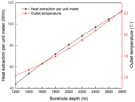 The MDBHE is developed on the basis of a shallow-buried tube heat exchanger, so the buried tube depth is an important design parameter for it. Since 120 days is usually the length of a heating season, all the results obtained in the following sections arebased on this simulation length. It should be noted that the whole study is mainly focused on thermal performance, with few concerns about other factors. As shown in Figure 3, with an increase in the depth of the buried tube, the heat extraction per unit meter and the outlet temperature gradually increase, and the increase is basically linear. Because the deeper the geological layer, the higher the temperature the fluid can reach, the more heat can be extracted. The heat extraction per unit meter of the MDBHE with a buried tube depth of 2800 m is 111.8 W/m, which is 2.54 times that of the buried tube depth of 1200 m (44.1 W/m). In addition, the evaluation index selected in this paper is the heat extraction per unit meter. If the whole borehole is considered as a unit, the total heat extraction of the MDBHE with a buried tube depth of 2800 m will reach 5.91 times that of the buried tube depth of 1200 m. It can be seen that the borehole depth has a considerable influence on heat extraction. Increasing the borehole depth can improve heat extraction, outlet temperature, land area, etc. However, on the other hand, increasing the borehole depth will also lead to a sharp rise in borehole costs.