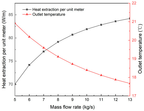 The mass flow rate is also a key factor affecting the performance of the MDBHE. As shown in Figure 4, the heat extraction per unit extension meter increases with the increase in the mass flow rate, while the outlet temperature decreases with the increase in mass flow rate. On the one hand, the larger the flow rate, the less the residence time of the fluid in the borehole and the less heat the fluid absorbs in the outer tube. However, at the same time, the heat dissipation in the inner tube is also reduced, and the increased fluid volume supplements the heat extraction. On the other hand, a higher flow rate will cause turbulence in the tube line, increasing heat extraction. Therefore, the heat extraction increases with the increase in the mass flow rate, which is an approximately logarithmic fitting, and the outlet temperature gradually decreases with the increase in the mass flow rate. When the fluid flow rate increased from 5 kg/s to 9 kg/s, the corresponding heat extraction per unit meter increased from 70.0 W/m to 80.7 W/m, with an increase rate of 15.3%. When the fluid flow rate increased from 9 kg/s to 13 kg/s, the corresponding heat extraction per unit meter increased from 80.7 W/m to 84.2 W/m, and the growth rate decreased to 4.3%.