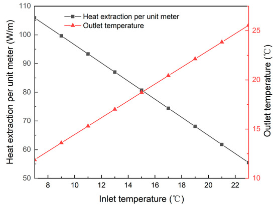 The performance of the MDBHE is also affected by the inlet temperature. As shown in Figure 5, the heat extraction per unit extension meter decreases with the increase in the inlet temperature, while the outlet temperature increases with the increase in the inlet temperature. As the inlet temperature increases, the temperature difference between the fluid and the outside world decreases, so less heat can be extracted from the ground. In addition, if the inlet temperature is higher, the upper fluid temperature of the MDBHE will be higher than the surrounding ground, so that heat is lost to the ground. Therefore, the generally lower inlet temperature can make the MDBHE obtain higher heat extraction. However, there are risks, such as freezing, if the inlet temperature is too low, and a much lower outlet temperature will induce degradation of the heat pump COP. The fluid at the inlet temperature warms up to the outlet temperature after heat exchange with the ground, so the outlet temperature increases with the inlet temperature.