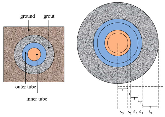 For the MDBHE, geometric parameters such as the borehole and tube diameter are also key factors to be considered in the design. In this paper, the buried tube radial structure parameters are divided into five parts: s0, s1, s2, s3, and s4, as shown in Figure 6. Among them, s1 and s3 are the tube thickness, which is not considered due to the small proportion and is set to a fixed value (10 mm); s0, s2 and s4 represent the inner tube size, outer tube ring size, and backfill ring size, respectively. It should be noted that the thickness of the inner tube is very important because it will influence the thermal short-circuit between the annular and center flows. However, the thickness of the center pipe usually follows some manufacturing codes, and in engineering practice, it is somehow a constant value.