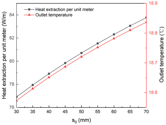 The sizing of the tube will change the characteristic length in calculating the Reynolds number, which will directly determine the value of the Nusselt number and thus influence the convective heat transfer coefficients h1 and h2. As shown in Figure 7, with the increase in the radial structure parameter s0 of buried tube, the heat extraction per unit meter and the outlet temperature both increase gradually. The larger the diameter of the inner tube, the longer the fluid stays in the inner tube, and the more heat will be lost to the outer tube. However, while s0 increases, the outer tube diameter and borehole diameter will still increase even if s2 and s4 remain unchanged. The increase in the borehole of the outer tube will increase the heat exchange area between the fluid and the ground. This increase in heat extraction is greater than the decrease in heat extraction due to the direct increase in the diameter of the inner tube. Therefore, the heat extraction per unit meter and outlet temperature are still increasing overall.