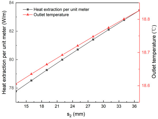 As shown in Figure 8, with the increase in the radial structure parameter s2 of the buried tube, the heat extraction per unit meter and the outlet temperature both increase gradually. Increasing the diameter of the outer tube can improve the heat recovery capacity because the heat exchange area between the fluid and the outside world is increased and the fluid residence time in the outer tube is longer. The annular region represented by the radial structure parameter s2 of the buried tube is directly related to the diameter of the outer tube. The outlet temperature also has gradually increased because of the improvement in the heat exchange capacity of the heat exchanger.