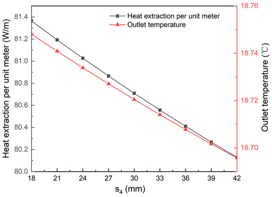 As shown in Figure 9, with the increase in the radial structure parameter s4 of buried tube, the heat extraction per unit meter and the outlet temperature both decrease gradually. The backfill material is located between the outer tube and the ground, so the thicker the backfill part, the greater the thermal resistance between the fluid and the ground. This results in a decrease in heat exchange between the fluid and the ground. The radial structure parameter s4 of the buried tube represents the radial distance of the ring region of the backfill part. Therefore, the heat extraction per unit meter and the outlet temperature will decrease with an increase in s4.