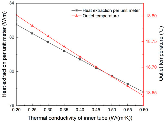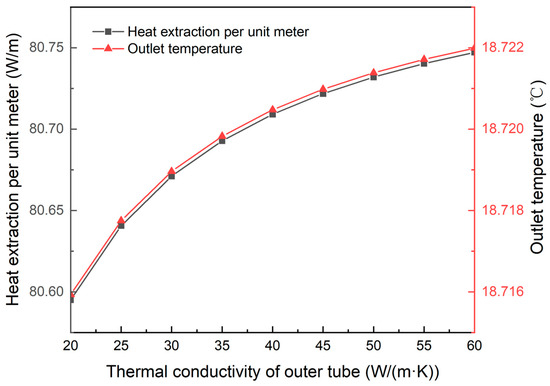 As shown in Figure 11, with the increase in the thermal conductivity of the outer tube, the heat extraction per unit meter and the outlet temperature both increase gradually. As the thermal conductivity of the outer tube increases, the thermal resistance between the fluid and the ground decreases, and more heat can be transferred at the same temperature difference. Therefore, the heat extracted from the ground by the fluid increases with the increase in the thermal conductivity of the outer tube, and the outlet temperature also increases.