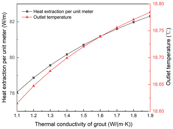 As shown in Figure 12, with the increase in the thermal conductivity of the grout, the heat extraction per unit meter and the outlet temperature both increase gradually. Similar to the thermal conductivity of the outer tube, the increase in the thermal conductivity of the grout will reduce the thermal resistance between the fluid and the ground, improve the heat extraction, and make the outlet temperature of the fluid higher.