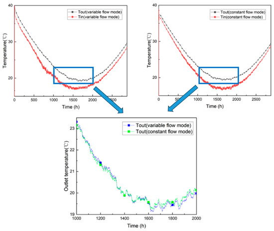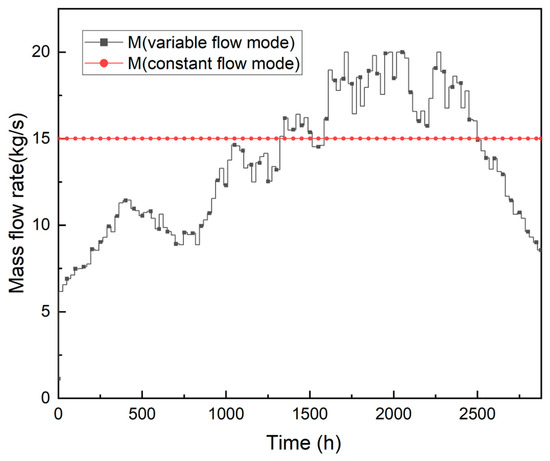 In addition, the variable flow operation mode has some advantages compared with the constant flow operation mode, as shown in Table 5. The average energy consumption of the pump in the variable flow mode is reduced by 9.6% compared with that in the constant flow mode when the difference in heat extraction per unit meter and the average COP [25] are small. After the end of a heating period, the decrease in ground temperature in the variable flow mode is also slightly smaller than that in the constant flow mode, indicating that the ground temperature recovers faster, which is conducive to the long-term operation of the MDBHE.