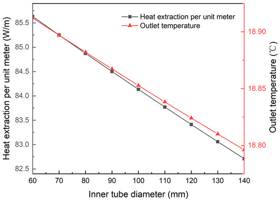 Next, the effect of the inner tube diameter on the performance of the MDBHE is studied in this paper. In the supplementary experiment, the sum of s0 and s2 is set to a constant value, and when s0 increases/decreases, s2 decreases/increases, so the increase or decrease in s0 will not affect the outer tube diameter and borehole diameter. The simulation results are shown in Figure 16. With the increase in the inner tube diameter, both the heat extraction per unit meter and the outlet temperature gradually decrease, thus confirming the above. The larger the inner tube diameter, the greater the increase in the residence time of the fluid in the inner tube. In this way, more heat is lost to the outer tube, resulting in less heat extraction.