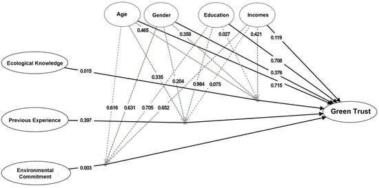 Furthermore, the interaction of age between a previous experience (ß = −0.082; t = 0.965; p > 0.05), ecological knowledge (ß = −0.058; t = 0.731; p > 0.05), and commitment (ß = 0.087; t = 0.502; p > 0.05) towards green trust does not have a significant effect. This implies that the age of participants did not have a significant impact on the relationship between green trust and predictor variables. Additionally, a similar result is reflected in the moderation of gender and income, whose p-value is <0.05. However, it was observed that the education level (ß = 0.173; t = 2.216; p < 0.05) of Latino participants did have a moderating effect on the relationship between ecological knowledge and green trust. Hence, it seems that individuals with higher academic achievements are more likely to have a deeper understanding of environmental problems and policies, which can lead to a more trusting attitude towards eco-friendly practices promoted by green hotels. Although the ANOVA analysis revealed no differences between the education and ecological knowledge groups in terms of the degree of relationship between EK and GT, the interaction between the two groups did seem to strengthen the relationship between the two groups. Interaction plots are depicted in Appendix A. The illustration of the interaction between demographic profiles and ecological knowledge is provided in Figure A1. Figure A2 displays the interaction between previous experience and demographic profiles. Figure A3 illustrates the interaction between demographic profiles and environmental commitment.