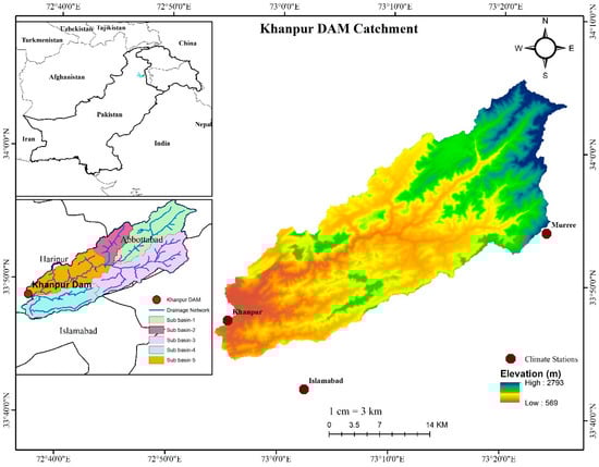The Khanpur Dam was constructed at 33°48′06″ N and 72°55′50″ E, on the Haro River; Khyber Pakhtunkhwa (KPK) and the capital region are its catchment areas. Its perimeter is 232.4 km, and its catchment area is 783.82 km2. The height of the Khanpur Dam is 50.9 m, its volume of storage is 130.7 Mm3, and its design flood is 5153 m3 per second. It has a 501.81 km2 gross command area, of which 147.58 km2 are culturable command areas. It delivers irrigation water at a rate of 11.52 m3 per second to the districts of Attock and Rawalpindi. It supplies water at a rate of 5.37 m3 per second to Rawalpindi and Islamabad. The Murree, Ayubia, and Margalla Hills are the mountains from whence the Haro River rises. Four significant tributaries feed the river, including Lora Haro, Stora Haro, Neelan, and Kunhad. The river is filled as a result of precipitation, with some elements coming from snowmelt. The Islamabad and Murree rain gauge stations are the nearest meteorological stations to the catchment area. The Khanpur Dam catchment area is shown in Figure 1. The Khanpur Dam is a popular location for day trips outside of the twin cities of Islamabad and Rawalpindi. People visit the area for picnics and to participate in a variety of sports including swimming, paragliding, boating, etc.