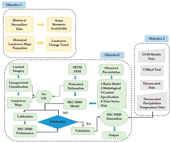 In the current study, the consequences of anthropogenic activities and warming temperatures are considered separately, since watersheds are especially susceptible to the impacts of environmental transitions and human activities in moist surroundings []. Therefore, the Khanpur Dam catchment area, an oppressive Margalla Foothills basin, is the focus of the current study. This basin’s water supply is primarily utilized to provide drinking water to adjacent municipalities, including Islamabad’s metropolis. The land usage in this basin has seen significant change during the previous years. The primary goals of this investigation are as follows: (a) To compare various statistical downscaling strategies and to downscale future temperature and precipitation estimates using GCM data; (b) to estimate, using a hydrological model, the effects of future climate change and land cover change on streamflow at the Potohar Plateau basin under CMIP6 models.