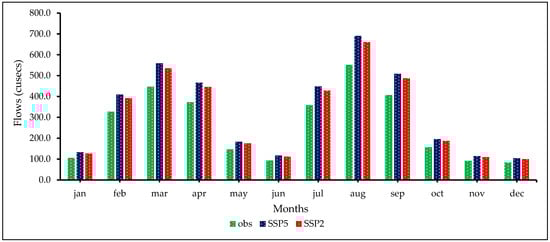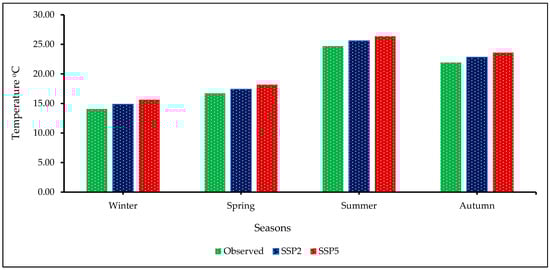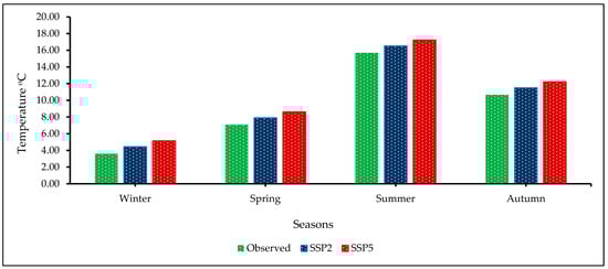 As shown in Figure 3, the analysis of seasonal variation reveals that each of the four seasons had increased peak temperatures. Figure 3 shows that the peak winter temperatures increase from 14.06 °C to 14.86 °C and to 15.63 °C under SSP2 and SSP5, respectively. Under SSP2 and SSP5, the peak summer temperatures increase from 24.7 °C to 25.59 °C and to 26.36 °C; however, the peak autumn temperatures increase from 21.91 °C to 22.83 °C and to 23.6 °C, respectively. The maximum temperatures in springtime increased under SSP2 and SSP5, respectively, from 16.71 °C to 17.4 °C and to 18.17 °C. Climate change has played a significant role in increasing the maximum temperature within the Khanpur Dam catchment area. One of the primary mechanisms behind this phenomenon is overall warming of the Earth’s climate due to an increased concentration of greenhouse gases, such as carbon dioxide, in the atmosphere. These gases trap heat from the sun, leading to a general rise in global temperatures. In the specific context of the Khanpur Dam catchment area, this global warming effect translates into hotter summers and prolonged heatwaves. Additionally, changes in regional climate patterns, such as altered precipitation and increased aridity, can exacerbate the warming trend. As a result, the higher temperatures not only directly influence the local climate but also contribute to increased evaporation rates from the dam’s reservoir, potentially affecting water availability and overall ecosystem health. Understanding these temperature changes and their drivers is essential for effective climate adaptation and water resource management in the region [,].