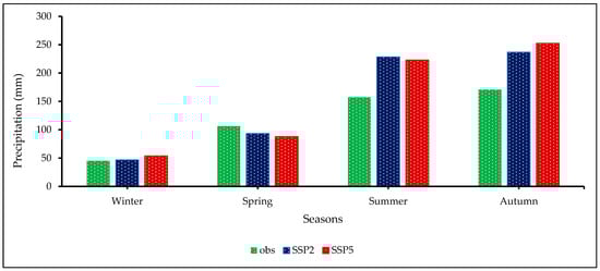 Precipitation in the Khanpur Dam basin region is anticipated to rise by 21% and 28% by the end of the twenty-first century, between 1532.7 mm in the original timeframe (1990–2015) to 1854.5 mm and to 1961.8 mm, under SSP2 and SSP5, respectively. The months of the year, divided into four seasons (spring is February, March, and April, while winter is November, December, and January), were utilized to study its evolution from a seasonal viewpoint. While August, September, and October are regarded as autumn months, May, June, and July are considered to be summer months.