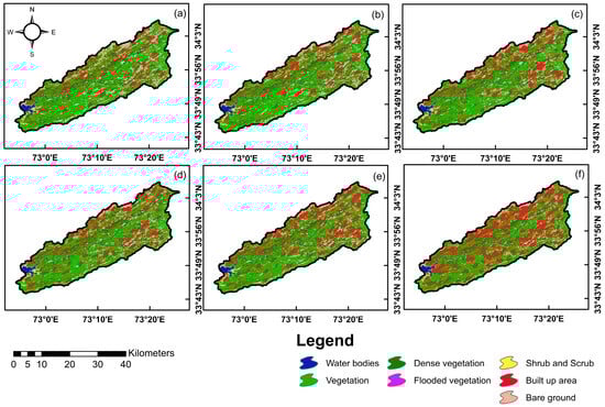 Land use and Future maps: (a) 2000, (b) 2010, (c) 2020, (d) 2030, (e) 2070 and (f) 2100, accordingly.