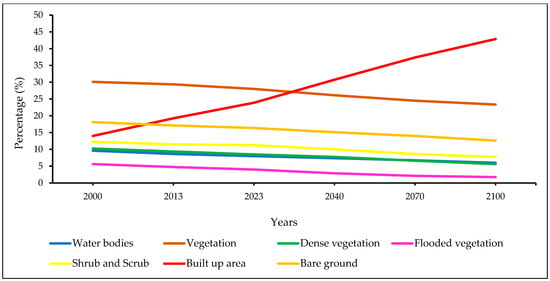 Figure 6 shows the projected land cover maps for the research region. The results indicate that, in the watershed of the Khanpur Dam, the areas of water bodies, vegetation, bare land, dense vegetation, flooded vegetation, and scrub decreased by 3.6%, 6.8%, 5.5%, 4.6%, and 3.9%, respectively, between 2000 and 2100. Even though the built-up area increased by 28.9%, this is still a considerable growth. Figure 7 depicts this shift in land cover classifications. The increase in the built-up area within the Khanpur Dam catchment area can be attributed to various socioeconomic factors, including population growth, urbanization, and infrastructure development. As the local population continues to expand, there is a rising demand for residential, commercial, and industrial areas, resulting in the conversion of natural landscapes into built-up environments. This urban expansion often leads to the transformation of water bodies, vegetation, bare land, dense vegetation, flooded vegetation, and scrub into paved surfaces and structures. Additionally, factors like increased agricultural activities and deforestation can further contribute to land use changes. Simultaneous decreases in the natural and semi-natural land cover types underscore the complex interplay between human activities and environmental dynamics, emphasizing the need for sustainable land use planning and conservation efforts to mitigate the ecological and hydrological impacts of these transformations.