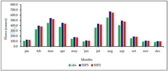 The “MPI-ESM1” model was chosen as the climate model for evaluating future climatic trends of the research region because it had comparably better R2, NSE, and RMSE values than the other models for rainfall, highest temperature, and minimum temperature, as listed in Table 2, Table 3 and Table 4 above. This study evaluated climate forecasts for the time period 2016–2100, including precipitation as well as minimum and maximum temperatures, for the MPI–ESM1 model for both shared socioeconomic pathways (i.e., SSP2 and SSP5). Applying the hydrological simulation software CMhyd-2016 with inputs from the climate model, the datasets were bias corrected.