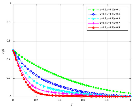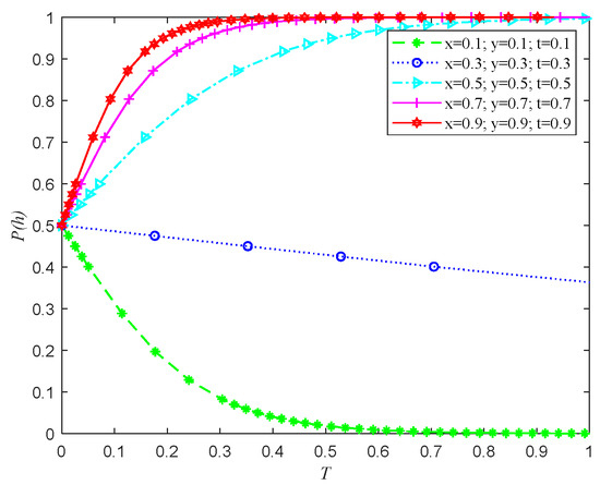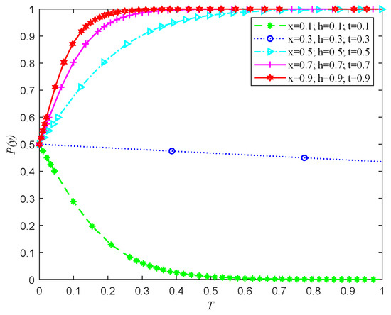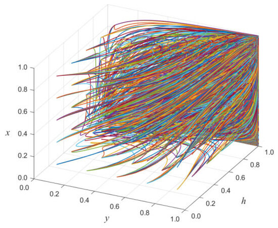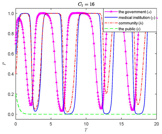 Solving the non-linear equation system (25) can obtain the equilibrium point of the evolutionary game among the government, medical institution, community, and the public. This includes 16 pure strategy equilibrium points E1(0,0,0,0), E2(0,0,0,1), E3(0,0,1,0), E4(0,0,1,1), E5(0,1,0,0), E6(0,1,0,1), E7(0,1,1,0), E8(0,1,1,1), E9(1,0,0,0), E10(1,0,0,1), E11(1,0,1,0), E12(1,0,1,1), E13(1,1,0,0), E14(1,1,0,1), E15(1,1,1,0), E16(1,1,1,1), and mixed strategy equilibrium point E* (x*, y*, h*, t*).
