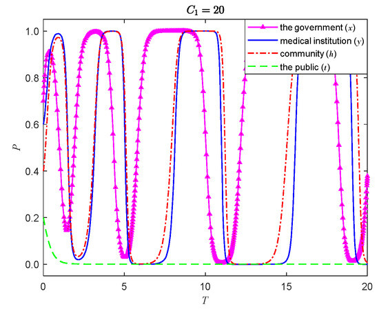 From Table 3, it can be seen that, under government strict regulation, there may be a stable pure strategy equilibrium point E15(1,1,1,0). When condition 1 is established, this indicates that the regulatory cost paid by the government is greater than the rewards given to the medical institution and community, and that the cost paid by medical institution and community for taking positive actions is greater than the penalty imposed by the government for taking negative actions. At this point, the evolutionary stability strategy of the four-party evolutionary game is as follows: the government’s stability strategy is strict regulation, the medical institution’s stability strategy is active treatment, and the community provides security safeguards. As a result, the psychological crisis intervention process can be maximized and runs smoothly without public supervision, i.e., E15(1,1,1,0).