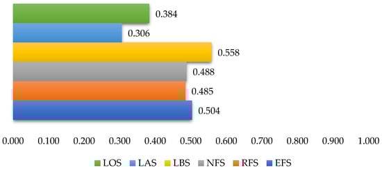The overall food and livelihood security values (LA) for six types of farming households were derived by averaging the values obtained for EFS, RFS, NFS, LBS, LAS, and LOS from the sampled households in the area in this research, following the methodology described by Yang et al. in 2018 []. Lower entropy values signify greater indicator dispersion, indicating that the indicator’s relevance to the comprehensive evaluation objective is directly proportional to the information’s usefulness [].
