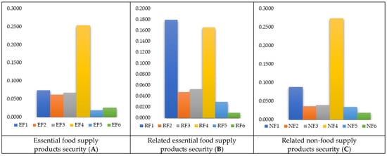 - Essential food supply products security (EFS): Figure 3A shows that most farmers in the area primarily focus on producing essential food supply products, either for household use or sale. Abundant natural resources, including freshwater, brackish water, and saltwater areas, support a diverse range of product cultivation. The evaluation results emphasize the importance of product diversity, with the highest score (0.2540) among the six specific evaluation indicators, highlighting the significance of promoting various food products for enhanced food security.