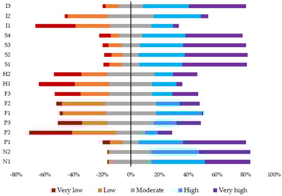This study employed 32 secondary indicators categorized into six groups to assess food and livelihood security among the farmers. The results revealed that sea salt communities achieved an average score of 2.724 for food and livelihood security. This total comprises a food security score of 1.476 and a livelihood security score of 1.248. Of the six primary indicator categories in Figure 2, “livelihood background security” received the highest score (0.558), followed by “essential food supply products security” (0.504), “related non-food supply products security” (0.488), “related essential food supply products security” (0.485), “livelihood outcomes security” (0.384), and “livelihood assets security” (0.306).