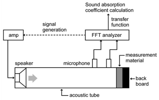The sound absorption performance of the compression board as a test specimen was measured as follows: the transfer function method, which includes an acoustic tube and two microphones, was used to measure the normal-incidence sound absorption coefficient under rigid wall contact conditions, as shown in Figure 2. To measure the vertical incidence sound absorption rate, an acoustic tube (WinZacMTX, manufactured by Japan Acoustic Engineering Co., Sumida-ku, Tokyo, Japan) capable of measuring the frequency band from 200 to 4800 Hz was used with a test specimen 40 mm in diameter. The measurements were conducted in accordance with ISO 10534-2 [33].