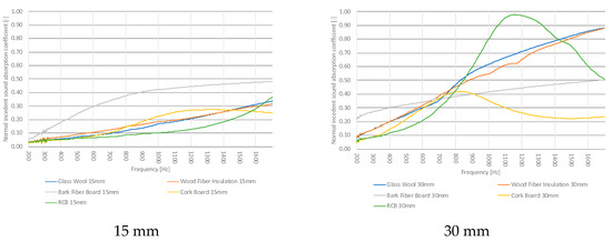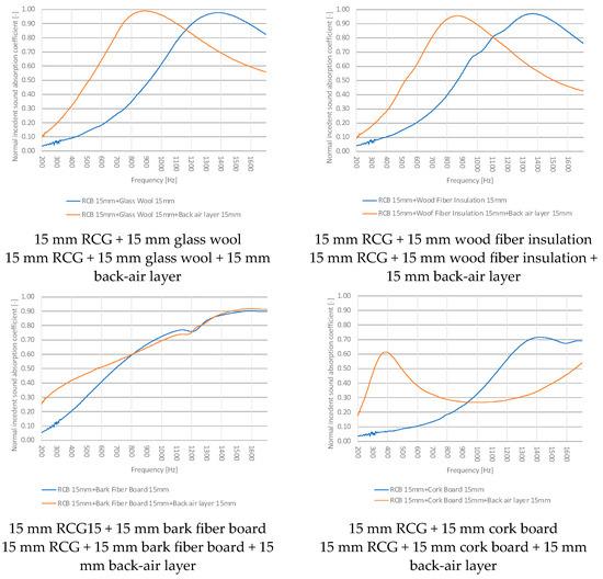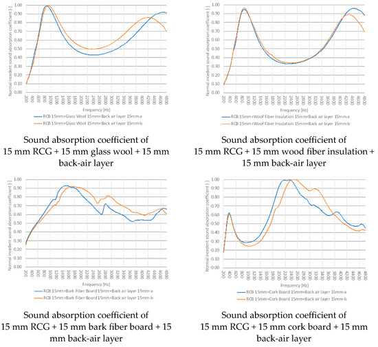By installing an air layer behind the material in materials that combined RCB and glass wool, the frequency band that initially showed a peak in the sound absorption rate shifted from 1200–1600 Hz to 700–1100 Hz, confirming effective sound absorption in the lower frequency band. Nearly identical results were obtained with the RCB and wood fiber insulations. For the bark fiber board, the sound absorption rate increased in the 200–800 Hz frequency band but was almost the same as when there was no air layer in the 800–1600 Hz range. On the cork board, a peak in the sound absorption rate shifted to the low-frequency band of 300–500 Hz, but the absorption rate remained at 0.6. The combination of RCB and glass wool and RCB and wood fiber insulation (15 mm + 15 mm) indicated that by adding an air layer (15 mm) behind them, they can effectively absorb sound in the target frequency band of 500–1000 Hz.