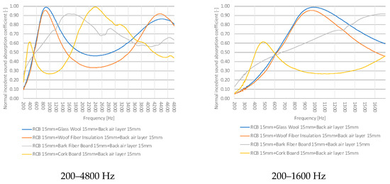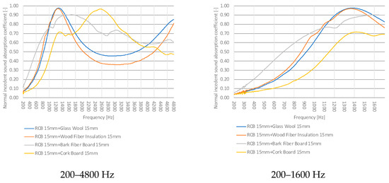 Figure 11 shows the sound absorption coefficient measurement results when the other porous materials were overlaid behind the RCB (15 mm). Two samples were prepared and tested. The average sound absorption coefficient measured from the two samples is presented, and the data comparing the sound absorption coefficient of each material for the frequency ranges of 200–4800 Hz and 200–1600 Hz are shown in Figure 12. To compare the sound absorption effects in the low-frequency band, which is the target of this study, a comparison with the sound absorption coefficient of standalone porous materials of the same 30 mm thickness is presented in Figure 13.