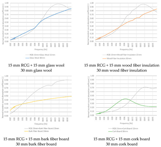 In materials layered with RCB and glass wool as well as RCB and wood fiber insulation, the first peak of sound absorption was observed in the frequency band of 1000–1600 Hz, exhibiting a high sound absorption coefficient of 0.8 or more. In this frequency band, when compared to the sound absorption coefficients of glass wool and wood fiber insulation of the same thickness (30 mm), the layered materials demonstrated superior sound absorption performance. This suggests that the RCB effectively enhanced sound absorption in that frequency range.