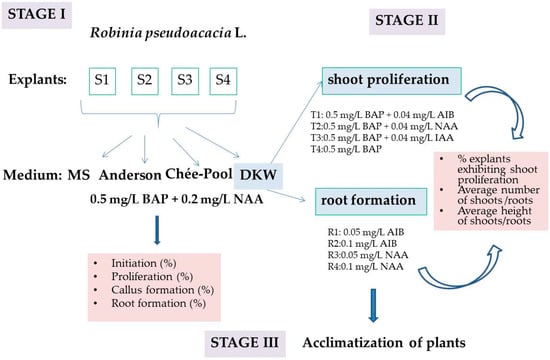 Robinia pseudoacacia L. is a fast-growing, multi-purpose nitrogen-fixing tree that is used for timber and firewood as an important melliferous species and with very good results in the conservation and fight against soil erosion [1,2,3]. This species is mainly propagated via seeds. This method of propagation has the disadvantage that the plants obtained in this way are significantly uneven. Additionally, some Robinia plants produce few seeds. With a low yield for propagation, root or stem cuttings can also be used, but these methods are difficult and require tremendous efforts and a long time to grow, seeing as, in the case of root cuttings, the radicular biological material is limited, as it is collected in small quantities during the tree’s rest period to avoid injury. The propagation of valuable biotypes in culture involves their identification and selection followed by in vitro micropropagation that ensures a very good uniformity of propagules. Several papers have been published that addressed the problem of in vitro multiplication of this species, with emphasis on the type of explants and the type and concentration of plant growth regulators [4,5,6]. Plants that are regenerated in vitro form roots more easily than cuttings taken directly from mature trees and can also be produced in large numbers [7,8]. The results that have been reported so far have described a series of difficulties related to the in vitro micropropagation of some Robinia selections [5,9,10]. As approaches to the in vitro regeneration of this species, the literature has outlined propagation from nodal explants and axillary buds [11,12,13], the formation of adventitious shoots from the callus, leaves, and hypocotyl fragments, cotyledons [14,15], and embryogenesis [16,17].