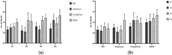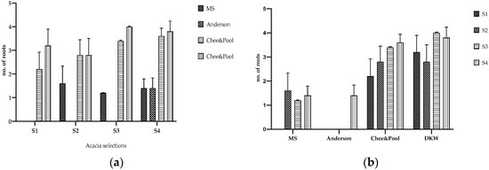 With the exception of the S1 selection, between 7% and 14% of the inocula on the MS formed roots. On the Anderson medium, only 7% of the S4 explants initiated the rhizogenesis process, and in the other selections this process did not commence. On the Chée–Pool and DKW media, all selections generated roots. The average percentage of rooting in all four selections on the Chée–Pool medium was 22.75%, and on the DKW medium the average on the selections was 31.5%. The following selections with a rooting percentage above the average were observed: S3 on Chée–Pool (28%) and S4 on DKW (42%). Regarding the number of roots formed (Figure 3a), no significant differences between the number of roots formed on the explants inoculated between MS and Anderson (p = 0.11923) and between Chée–Pool and DKW (p = 0.45856) were recorded, as well as significant differences between the other media (MS and Chée–Pool, MS and DKW, Anderson and Chée–Pool, and Anderson and DKW). The average number of roots on explants inoculated on MS and Anderson was 1.4 ± 0.19, on Chée–Pool media 3.0 ± 0.54, and on DKW media 3.4 ± 0.47.