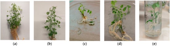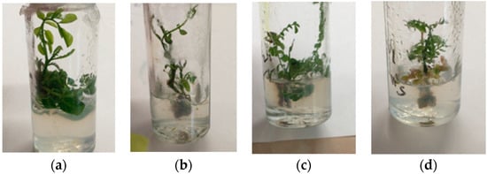 It has been demonstrated by the authors of [57,58,59,60,61,62] that this approach improves stomatal physiology and increases the production of epicuticular wax. The same authors recommended that the level of relative humidity should not drop below 80% in order to permit good aeration of the culture. Robinia pseudoacacia L. adapted to ex vitro conditions is shown in Figure 6. In our study, the average percentage of survival after 4 weeks was 68%.