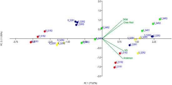 Principal component analysis (PCA) of the organogenesis process of four acacia selections. The red dots represent the percentage of S1 acacia selections’ root production (samples with R as the first letter) and proliferation (samples with S from shoots), while the yellow dots represent S2, the blue dots represent S3, and the green dots represent S4.