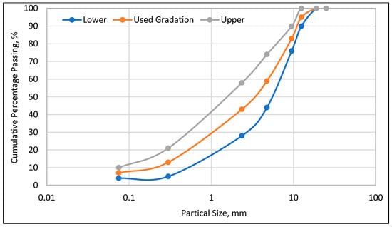 The purpose was to evaluate the impact of incorporating AR on the performance of the HWBEM. The AR used was in the range of 1.25% to 5% of the weight of residual bitumen set at 1.25, 2.5, 3.75, and 5% (HWBEM-OPC-(AR content)%AR). For comparison purposes, the aggregate gradation shown in Figure 1 was used for all the specimens.