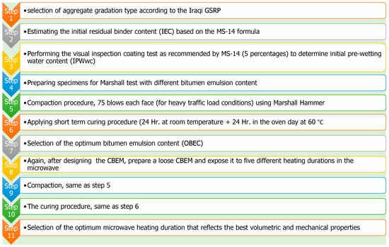The specimens of the CBEM and HWBEM were prepared in accordance with the design methodology specified in the MS-14 Asphalt Cold Mix Manual, Figure 2 [49]. To evaluate the compatibility between the aggregate particles and the emulsion binder, a coating test was performed. This test aimed to assess the ability of the emulsion binder to coat and adhere to the surface of the aggregate particles. This test is highly sensitive to the amount of pre-mixing water used, particularly in cases where the mixture contains a significant proportion of fine aggregate. The test helps determine the effectiveness of the emulsion binder in coating and bonding the aggregate particles, which is crucial for the overall performance of the mixture.