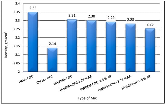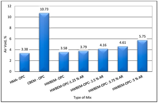 Figure 5 shows the density of the studied mixtures. Increasing the AR content in HWBEM samples resulted in some reduction in the density of the HWBEM samples containing AR. These samples contained excess water because this water formed a continuous phase with the AR. This volume of water was released from the mixture during the curing process, leading to a noticeable decrease in the density of these samples if heat was not applied. Likewise, the presence and loss of water had an impact on the air voids in the mixtures, as demonstrated in Figure 6.