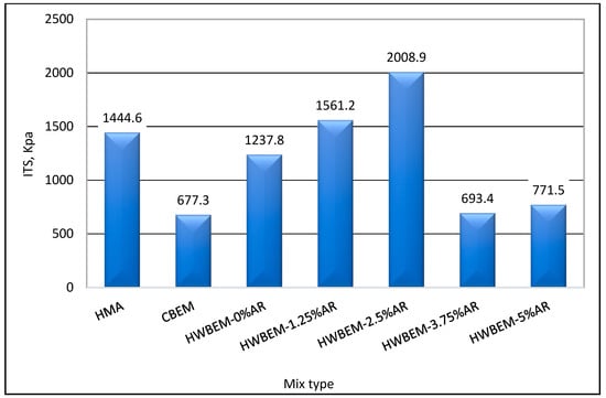 Adding AR to the HWBEM in an amount of up to 2.5% increased the ITS considerably. As shown in Figure 7, even a small AR content of 1.25% led to a higher ITS when compared to that of HMA, and doubling the AR content caused the HWBEM to perform superiorly compared to HMA. However, any further increase in AR caused a cliff fall in the tensile strength of the HWBEM. It is understood that the addition of AR initially led to the development of some interlocking in the aggregate phase of the mixtures. However, a further increase after the optimum point reduced binder–aggregate adhesion at the binder–aggregate interface.
