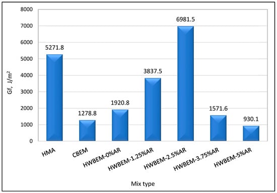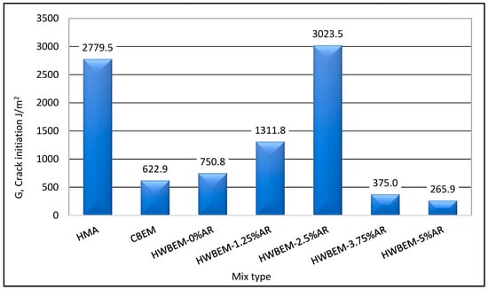 Cracking, though itself a type of distress, is the onset of future distress usually related to water ingress. Therefore, retarding crack initiation is vital for pavement performance, durability, and preservation. The energy required for the crack initiation (Gf-CI) of the mixtures in the study is presented in Figure 9. Heat treatment certainly improved the GF-CI value, but the inclusion of AR up to the optimum value of 2.5% tremendously enhanced the capacity of the material to absorb energy before crack initiation. As another confirmation of the effect of AR within the HWBEM mixtures, any further addition of AR considerably dropped the energy required before any crack initiation.