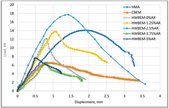 Figure 10 shows loading–displacement curves for all the study mixtures. It can be noticed that heat treatment was effective at enhancing the maximum indirect cracking load of the HWBEM when compared with that of the CBEM. Adding AR in an amount up to 2.5% certainly improved the HWBEM’s response to loading although it caused the HWBEM-1.25%AR and HWBEM-2.5%AR to be more brittle than HMA and CBEM (associated with the displacement position of Pmax compared with that of HMA). The viscous phases of HMA were more extensive than those of HWBEMs, possessed an enhanced capacity to dissipate energy and respond to loading, and therefore possessed a higher capacity to retain tensile strength, than that of CBEM.